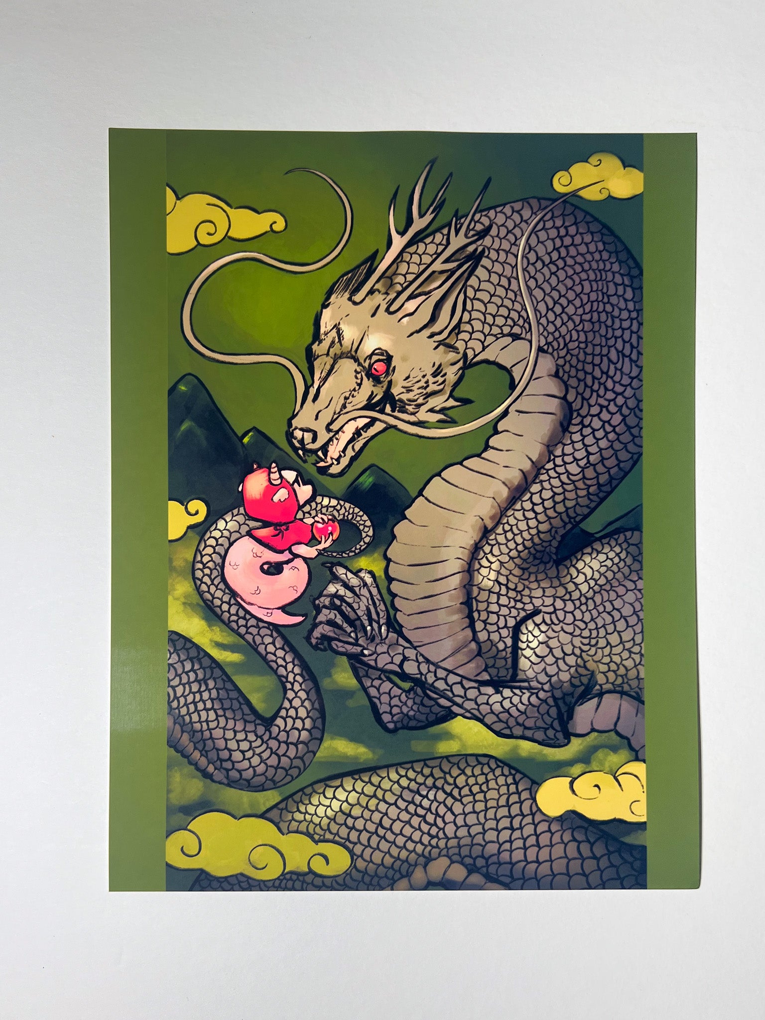 Unleash your imagination with the Dragon Hood Print by NickHidesArt. This unique piece showcases Little Red Riding Hood and her "grandma", now depicted as Eastern dragons. Intricately drawn, this print is sure to add a touch of artistic flair to any room.