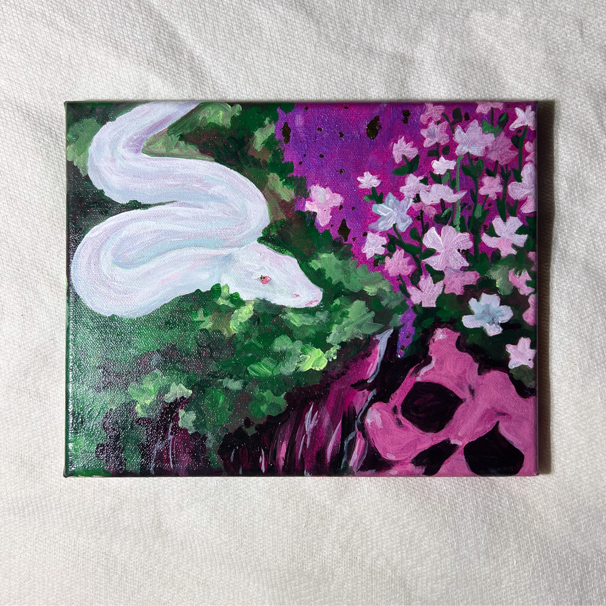 Discover the beauty of Forbidden Fruit, an 8x10 acrylic canvas painting by Paulina. A white snake atop a green cliff gazes upon a skull adorned with blooming flowers, all set against a starry background with golden flakes. Bring a touch of artistry and intrigue into your space.