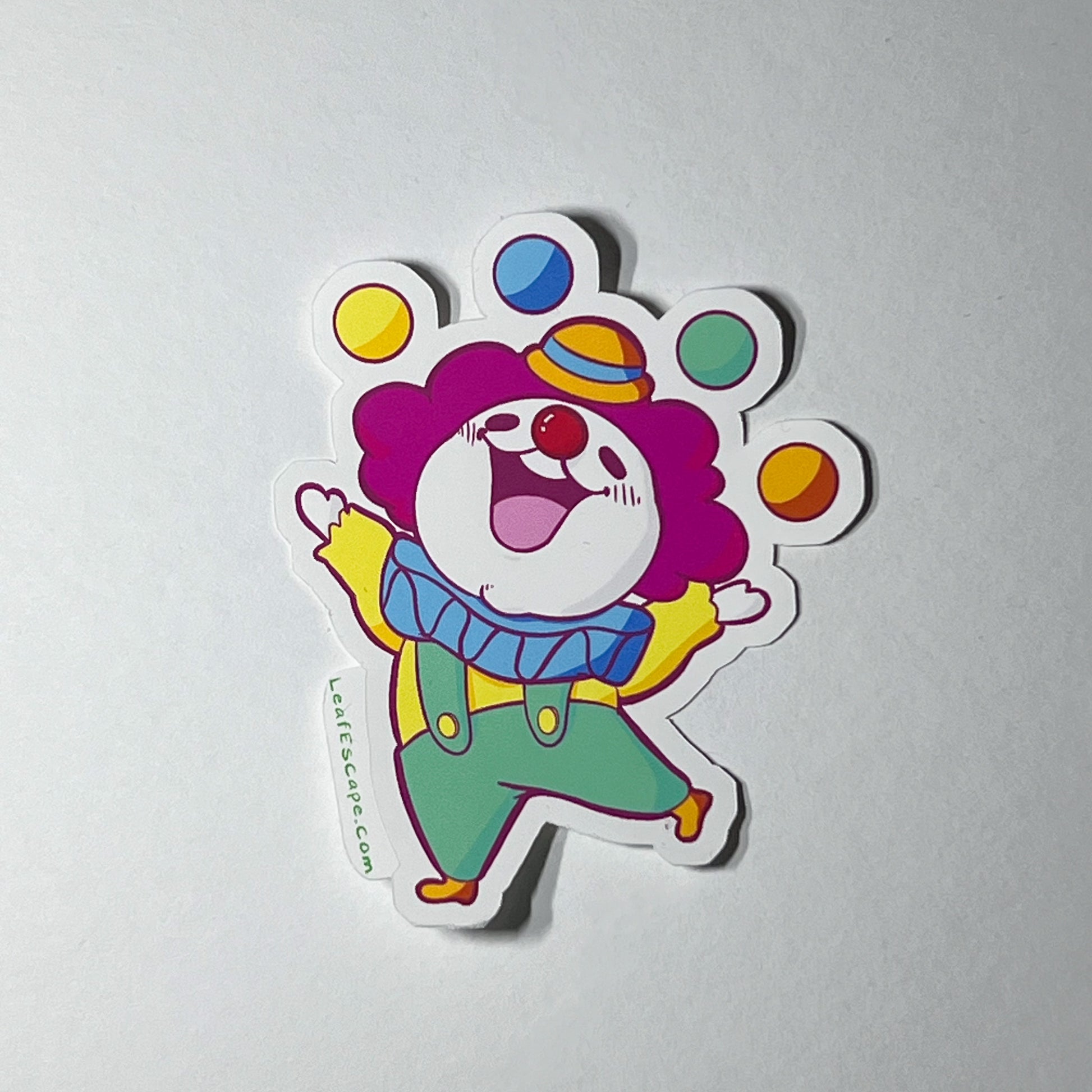 This sticker by NickHidesArt serves as a reminder to always make time for fun in life. The cheerful clown depicted in vibrant colors and round proportions juggles four balls with a contagious smile, adding a touch of color and playfulness to any surface. Let it inspire you to take a break and enjoy the little joys in life.