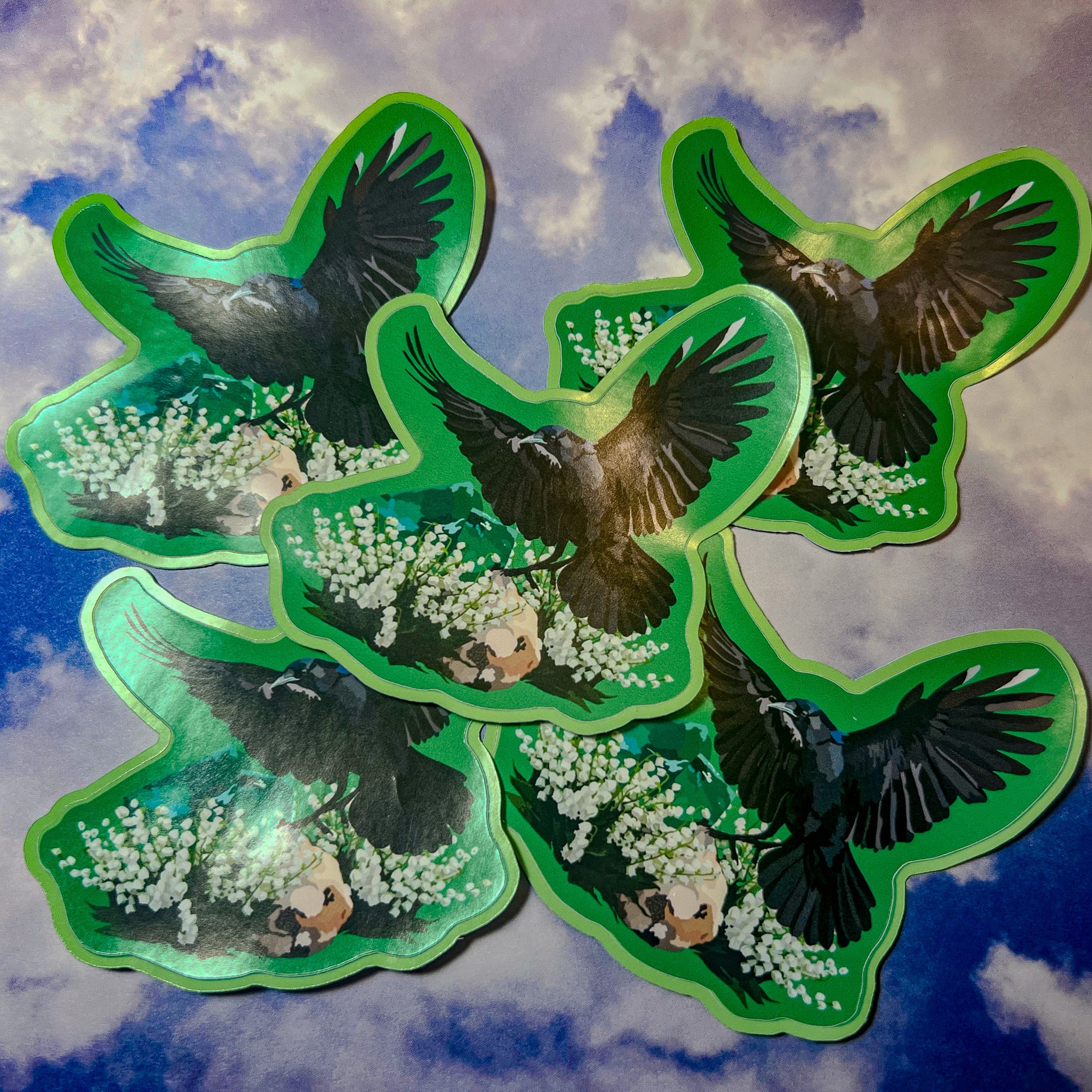 This May Crow Sticker, designed by Valk0rie, showcases a beautiful combination of a crow, Mays gemstone, and flower. This sticker is perfect for any sticker collection or craft project.