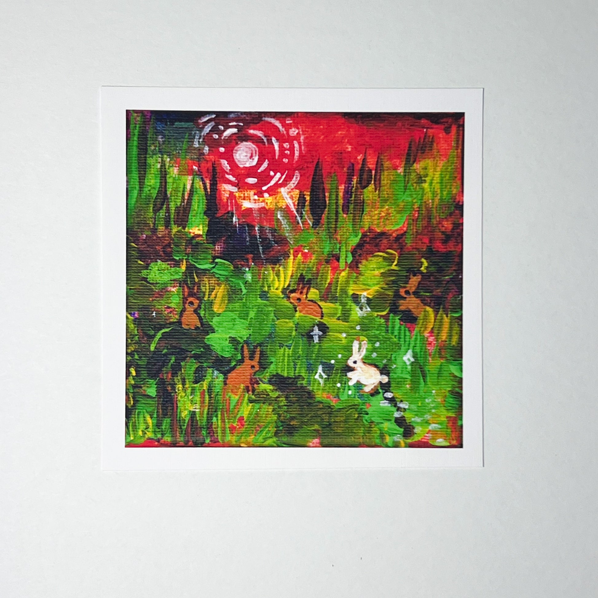 Introducing the Moon-kissed Rabbit Print, a 5x5in masterpiece by NickHidesArt. Inspired by the mystical connection between rabbits and the moon, this intricately detailed print features a unique mixture of red and cool colors, transformed into a charming scene with a stunning white rabbit as the focal point. Bring a touch of artistry and folklore to your home with this magical print.