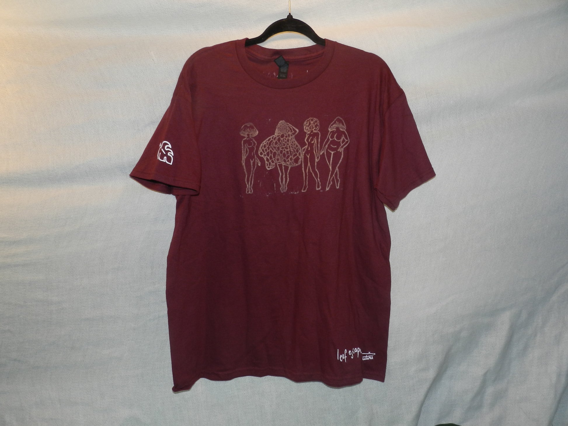 Adorned with a quartet of mystical mushroom ladies, these shirts feature Paulina's original block print design transferred through traditional hand-stamping techniques. The deliberate impression captures the raw, textural essence of printmaking—where ink meets fabric to create a visual poem. Each shirt embodies the delicate balance between artistic intention and the beautiful unpredictability of handcrafted impressions.