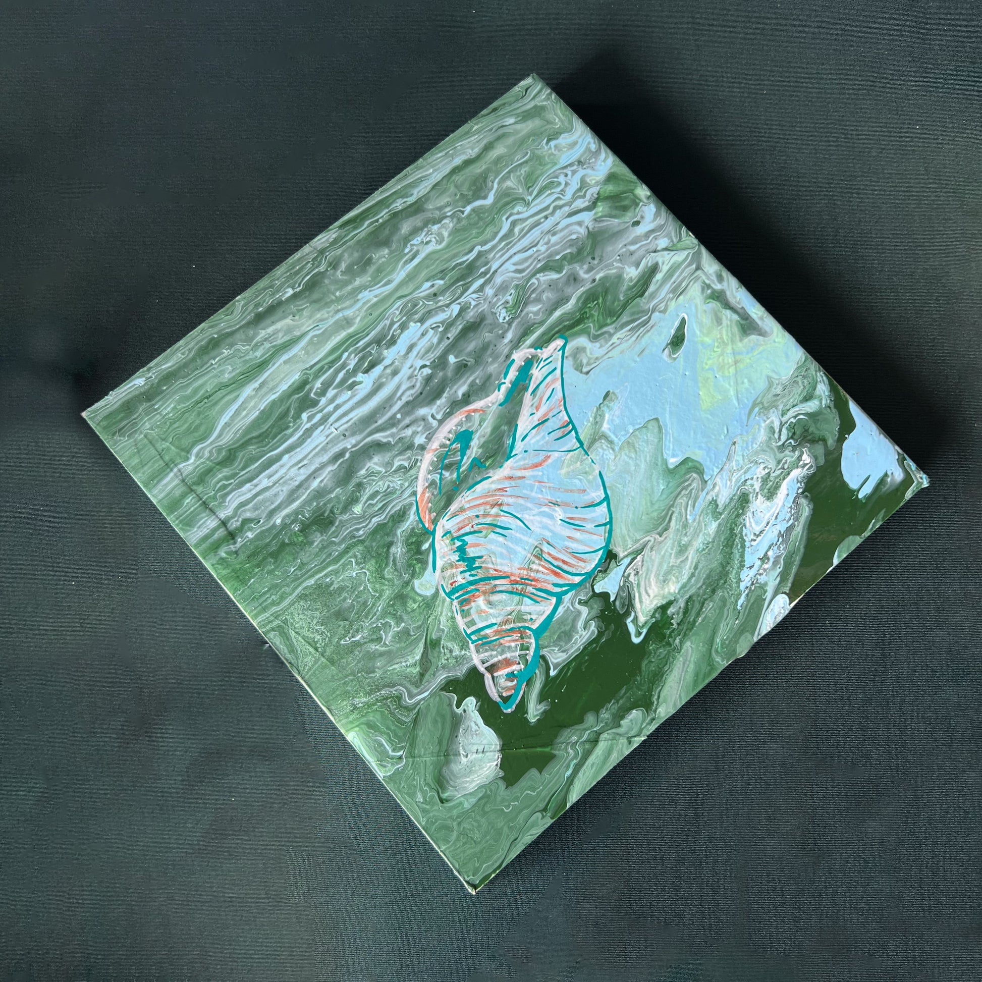 Add a vibrant touch to your home with Ocean Green, a stunning acrylic pour by Paulina. Its calming blues and greens set the perfect backdrop for the painted seashell, creating an awe-inspiring coastal scene. Invite the serenity of the sea into your home with this one-of-a-kind masterpiece.