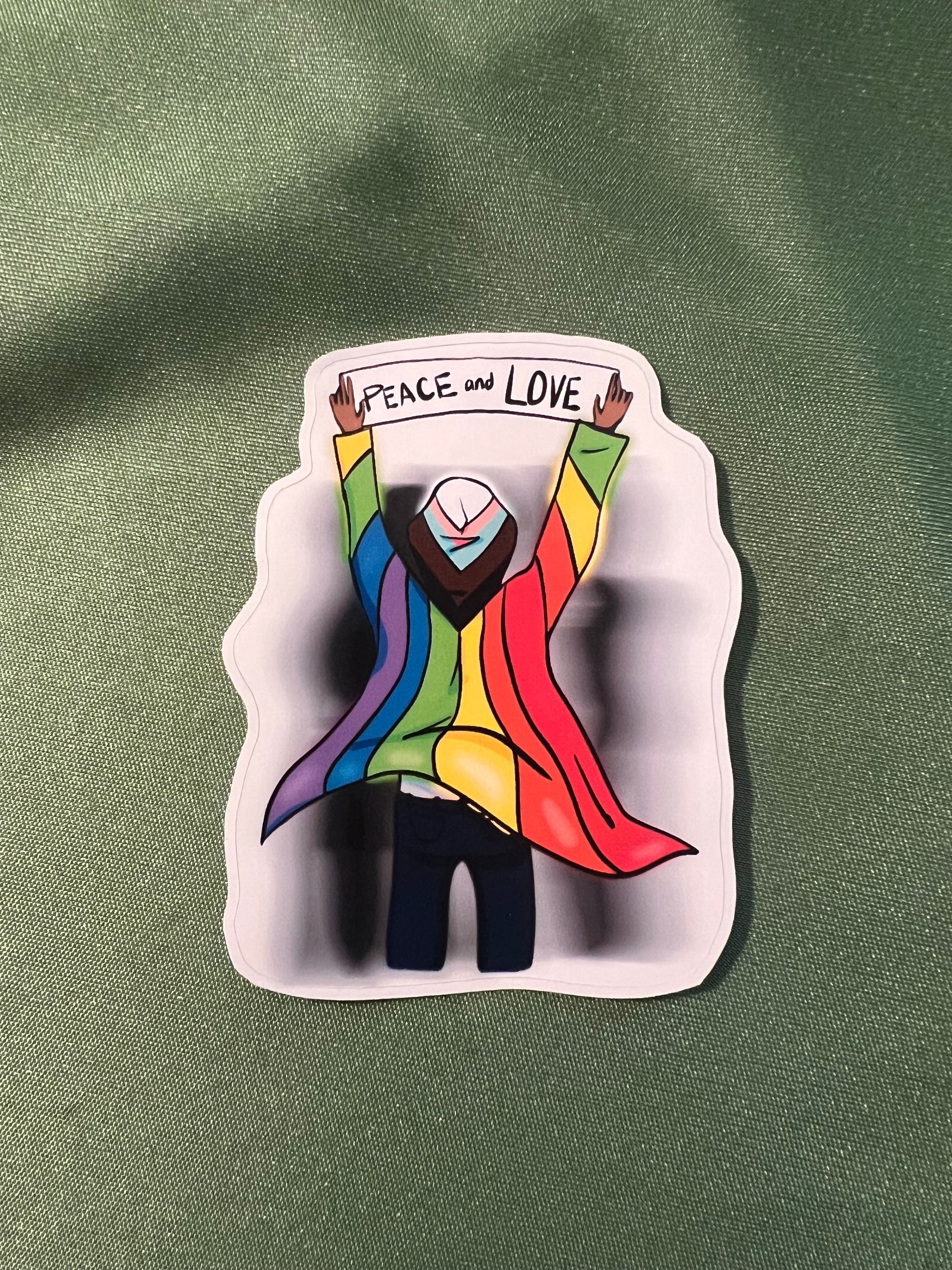 Celebrate unity and self-expression with this 3-inch sticker featuring a digital painting by artist Paulina. The artwork portrays a powerful figure wearing the pride flag as an outfit, symbolizing a protest for peace and love. Perfect for adding a meaningful touch to your laptop, notebook, or personal space, this sticker inspires hope and inclusivity through vibrant, artistic design.