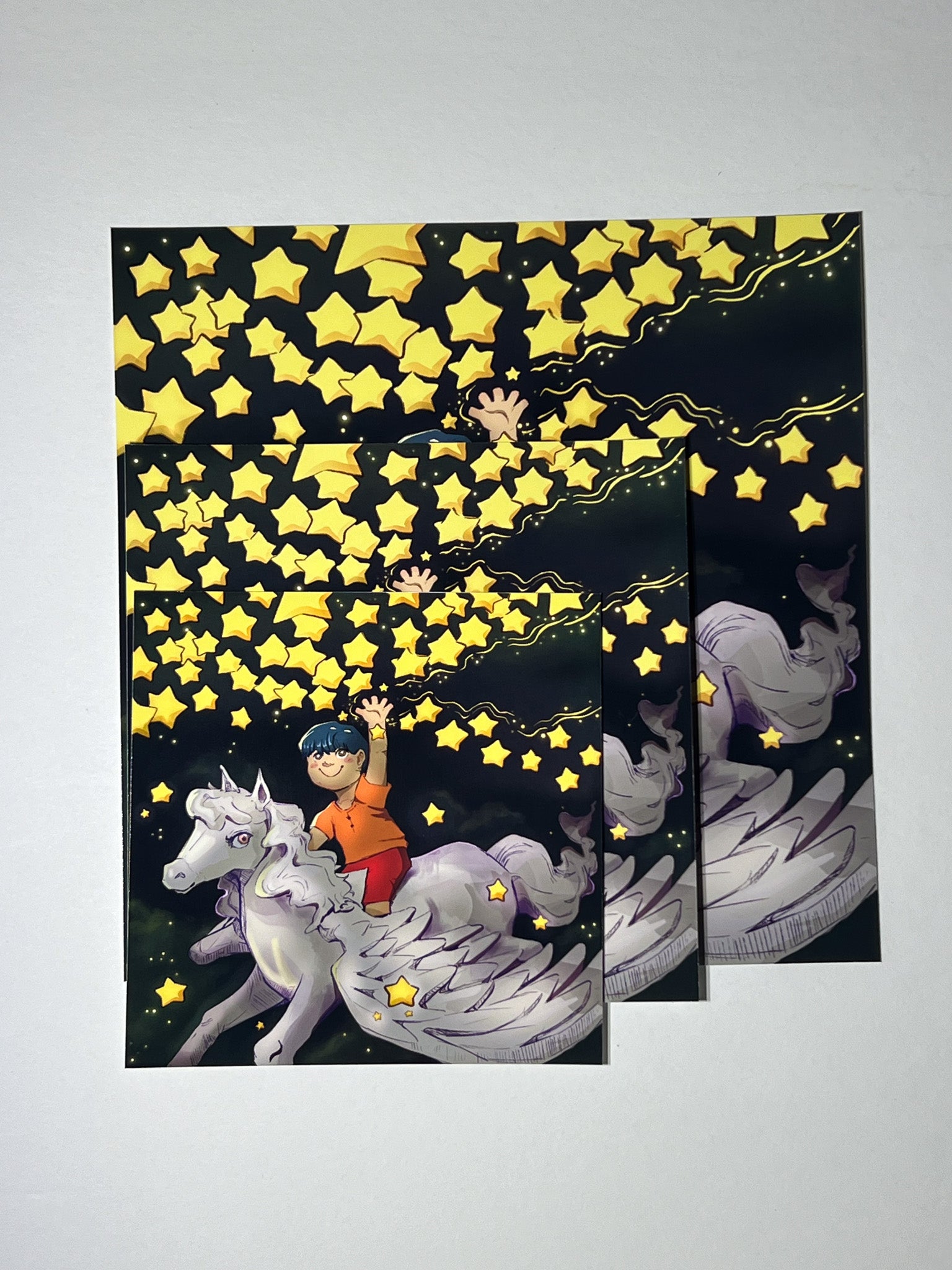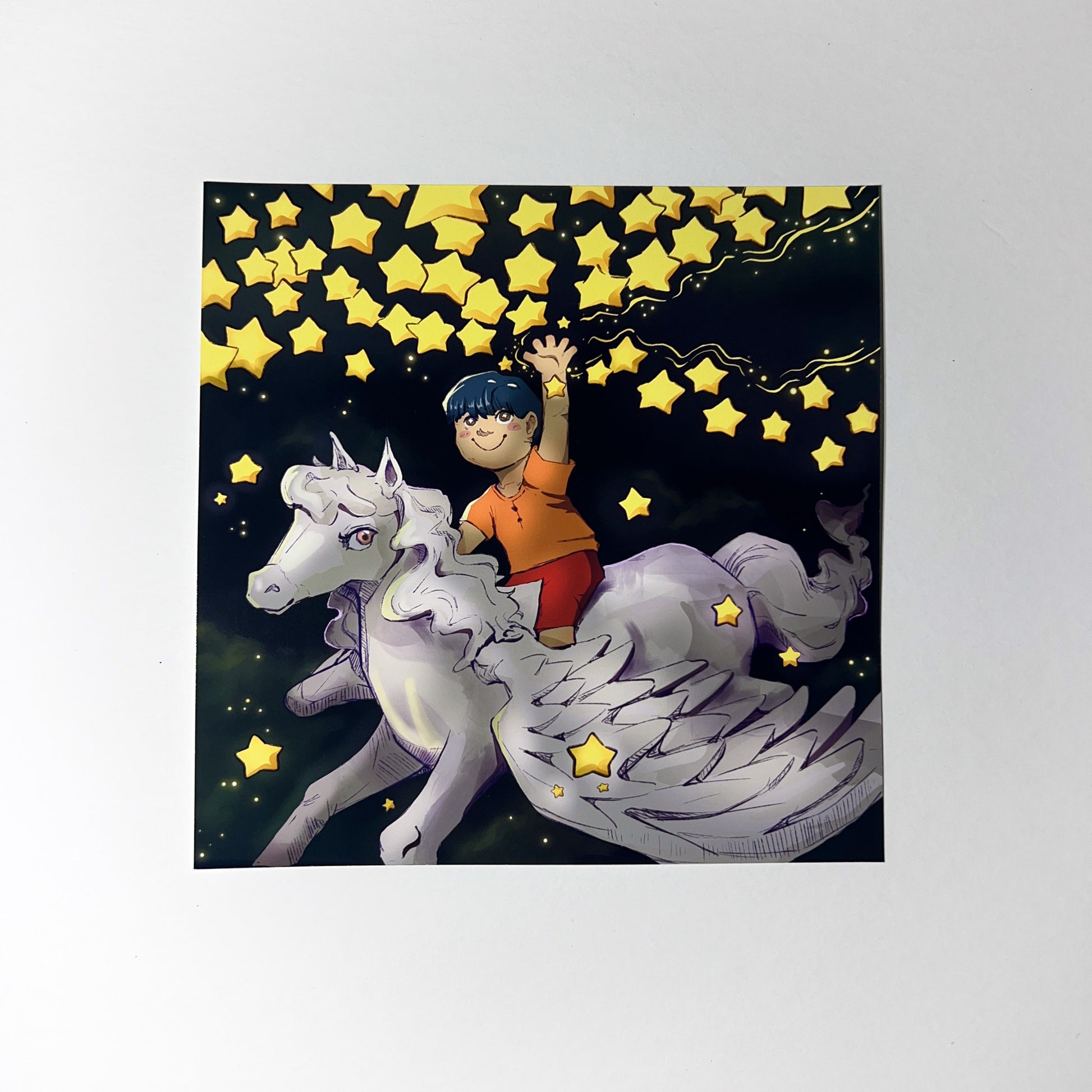 Experience the wonder of the night sky with Starry Ride Print. This digitally drawn piece by NickHidesArt features a boy reaching into a stream of stars, whisked away by a pegasus. With a sense of flow and emotion, it captures the essence of reaching for the stars.