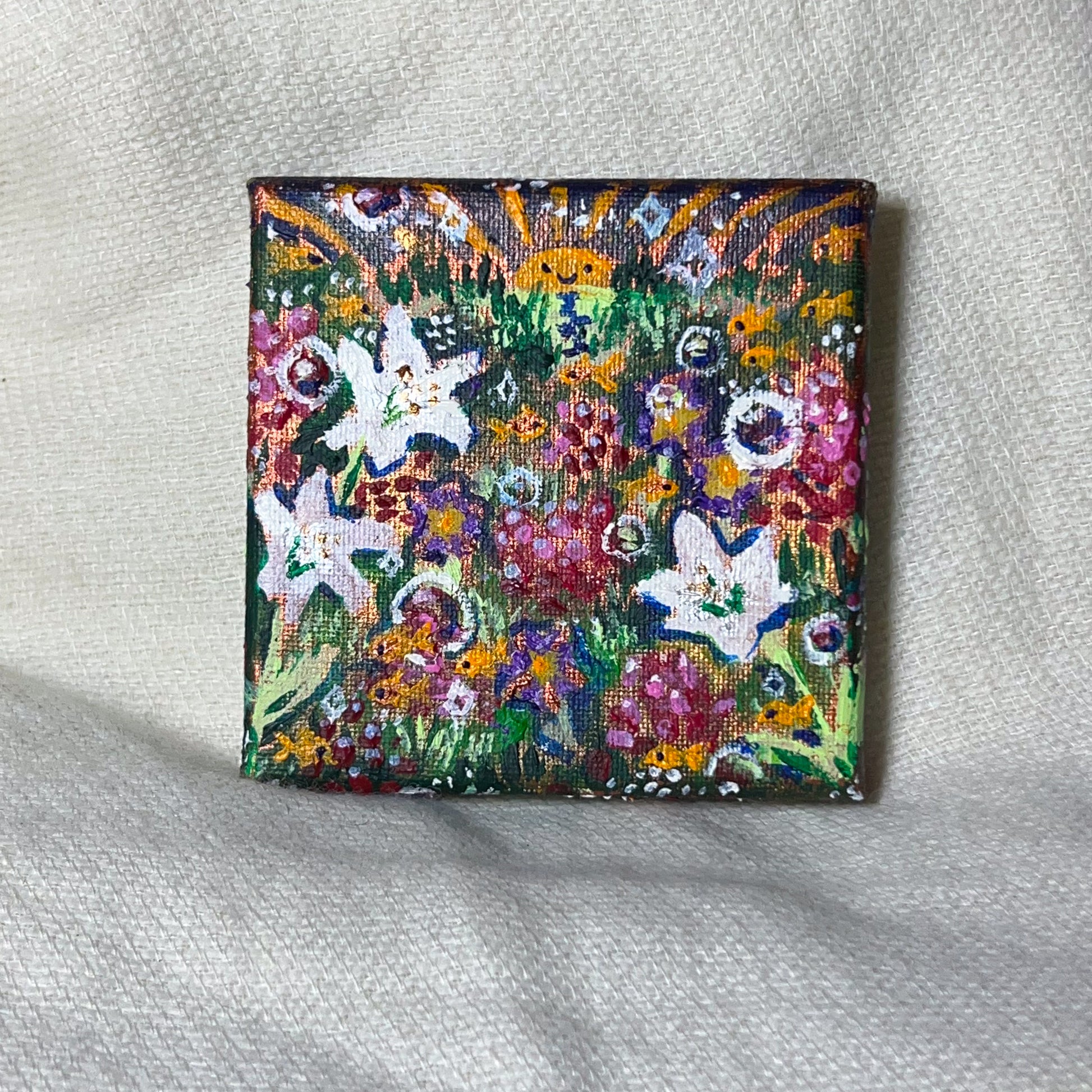 Experience the beauty and joy of nature captured in this 4x4 original acrylic painting by NickHidesArt. With a motto of "when in doubt add sparkles", this painting is adorned with stars, gold accents, and intricate flower patterns. The artwork extends to the edges for a seamless look. Add a touch of charm to any space with this one-of-a-kind piece.