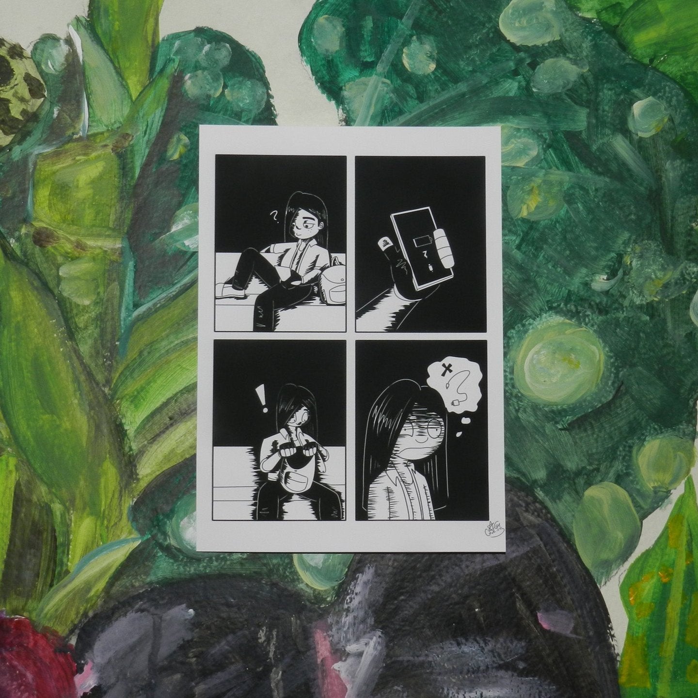 Discover the hilarious world of AG Comics with this digitally painted comic strip print, featuring AG's forgetful moment of leaving her phone charger behind. Measuring 5x7 inches, this print is the perfect addition to any space. Never forget your charger again with "Where's My Phone?" print!